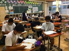 定期テスト1週間前から部活動の午後練習は停止となります。部活動停止期間中の放課後は、学年ごとに学習会を行っています。これは、本校の教育目標である「進んで学習する意欲ある生徒」の育成に向けた取組の一つとして昨年度から実施しています。原則として、自ら学習したい生徒が、学習したい教科に取り組む自主的な活動です。各学年、全体の1/3程度の生徒が、学習会に参加しています。理解不足なところを教員に質問する生徒や、黙々とワークを進める生徒など、それぞれが自分のペースで10月1日(木)、2日(金)の中間テストに向けて取り組んでいます。