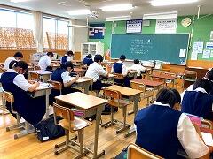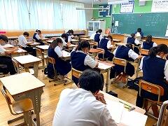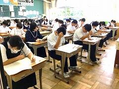 10月1日(木)、2日(金)の2日間、2学期の中間テストを行いました。1日(木)は理科、社会、国語、2日(金)は英語、数学、音楽、技術家庭のテストを行いました。教室では朝の会の前から教科書やノートを開き、最後の確認をしている生徒も多くいました。テスト中の校舎は静寂に包まれ、緊張感が伝わってきました。本校では定期テストを高校受験に合わせて、制服着用で行っています。
