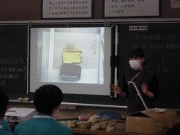 3年生の美術の授業では、やきものをつくります。グループに分かれて、調べた制作方法を発表しました。制作方法は、手びねり・ひもづくり・板づくり・型づくりの4種類あります。このクラスでは、「型づくり」のグループがなかったので、先生が「型づくり」の製作方法を説明しました。どのグループも丁寧に説明していました。