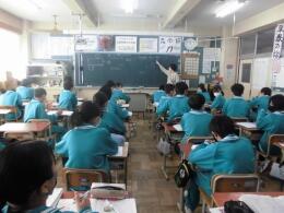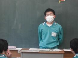 2年生の国語の授業では、自分の考えを文章にしてまとめ、暗誦して発表していました。評価項目は、話の内容・声の大きさ・表情・暗誦についてです。発表者は、しっかりとした態度で話をすることができ、聞いている人は、真剣に話を聞いて評価を記入していました。
