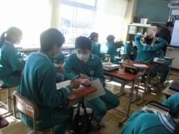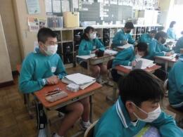 1年生の数学では「空間図形」を学習しています。先生の説明をしっかりと聞いてから、課題に一生懸命に取り組んでいました。3年生の社会では、「近代ヨーロッパと日本の開国」についての学習をしています。自分で調べたことや考えを何人かで話し合いながら、学びを深めていました。