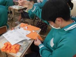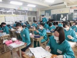 2年生の体育の授業では、女子は持久走で校舎周りを10周し、男子は校庭でサッカーをしました。みんな全力で体を動かし汗をかいていました。1年生の家庭科では、ミシンを使ってクッションを作っていました。ミシンの作業は、慎重に進めていました。