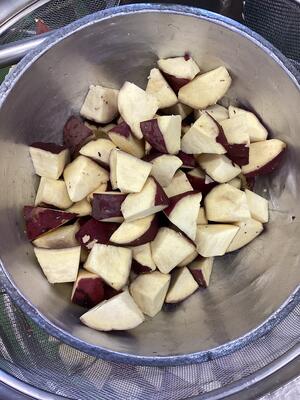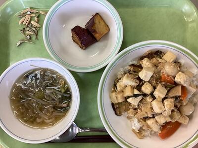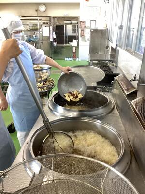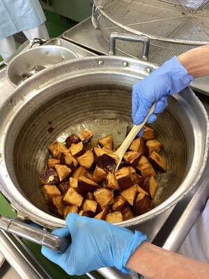 5月10日の給食 投稿日時 : 2023/05/10 豊四季中学校管理者 豆腐の中華煮丼 中華スープ 大学芋 小魚アーモンド 【大学芋の作っている所】 さつま芋を低温で長めに揚げて、甘みを出します。揚げた芋にタレをからめて出来上がりです。 {{options.likeCount}} {{options.likeCount}}