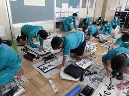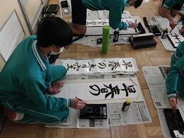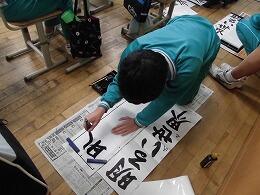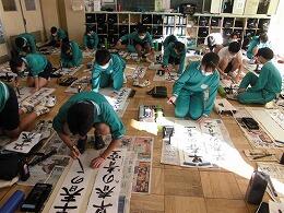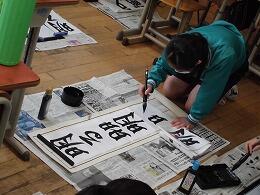 3年生は、国語の時間に書初めの練習をしています。みんな、床に道具を広げて、のびのびと書いていました。