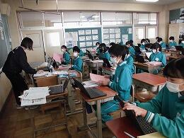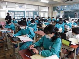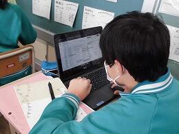 1年生の英語の授業では、クロムブックを使用して単語の意味を覚えていました。みんな、進んで取り組んでいました。