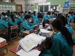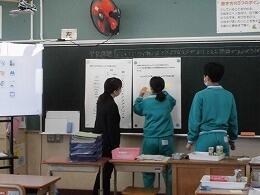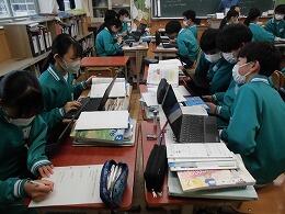 2年生の英語の授業では、班で調べたい人物を決めて、その人物について調べたことを英文にしてポスターをつくります。今日は、班で相談しながらタブレット等を利用して調べていました。