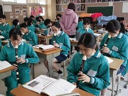 2年生の音楽の授業では、リーコーダーの学習をしています。楽譜を見て、課題曲を演奏していました。