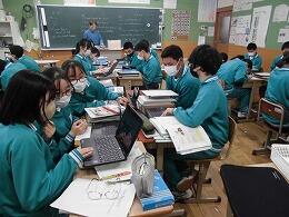 1年生の英語の授業では、タブレットを活用して単語や英文を覚えたり、ペアで発音を確認したりしています。みんな進んで学習していました。