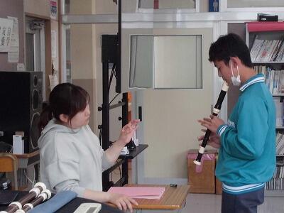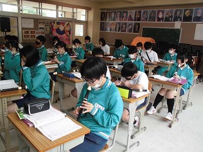 2年生の音楽の授業では、リコーダーの学習をしています。みんな楽譜をよくみて、演奏に集中していました。