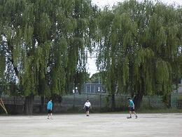3年生の体育の授業では、男子はソフトボール、女子はバスケットボールを学習しています。男子は、校庭で集中してバッティングをしていました。女子は、チームに分かれて熱い試合をしていました。