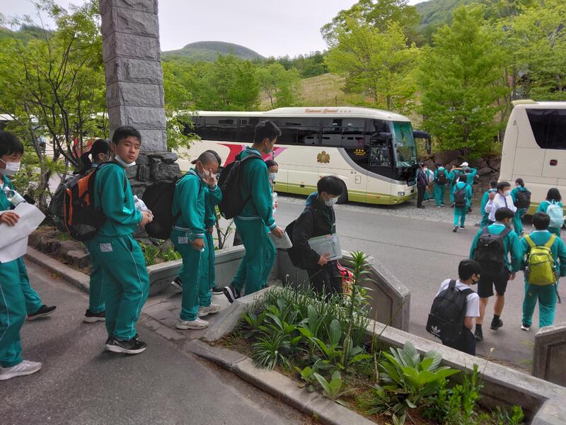 林間学校二日目です。こちらは、緑に囲まれて、空気がきれいです。朝ご飯を食べて、ホテルを出発しました。