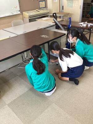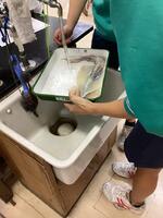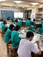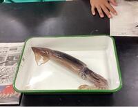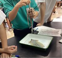 2年生の理科の授業で、「いかの解剖」を行っています。解剖手順に従って、いかの体の組織にについて学習していました。