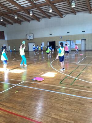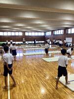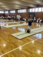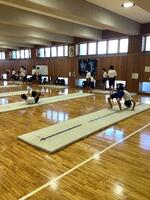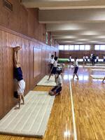 1年生の男子体育は、マット運動を行っています。各自で演技の練習を行っています。