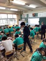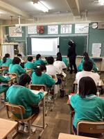 本日は、旭小学校の2年生6名が町探検で、豊四季中学校を探検にきました。2年生の家庭科の調理実習(クレープ作り)を興味深く見学していました。