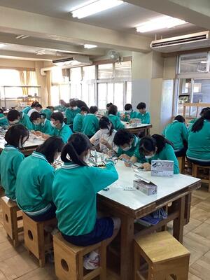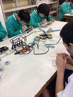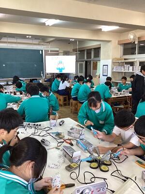 2年生の技術の授業では、「エネルギー変換」の単元で「電気エネルギー」について学習し、「ダイナモLEDライト」を制作しています。