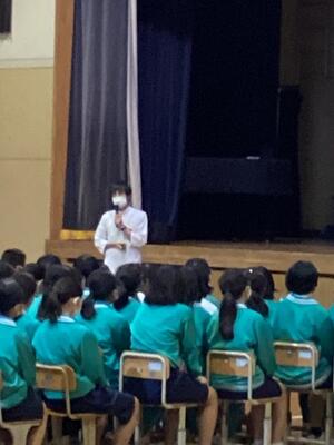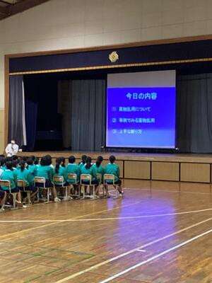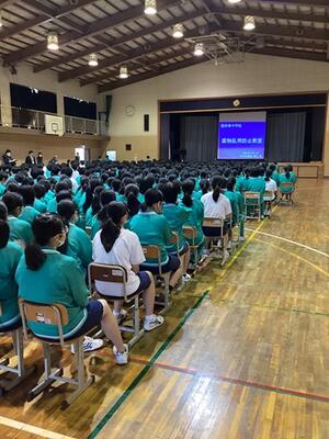 本日6校時は、全校生徒が体育館に集まり、「薬物乱用防止教室」を行いました。講師に「ゆずのき薬局」勤務で、本校の学校薬剤師の先生を迎え、全校生徒に向けて講義をしていただきました。