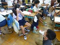 音がどのように伝わるのか,糸電話で体験しています。「糸がたるんでると聞こえないよ。」「ビリビリ震えてる。」楽しみながら学んでいます。