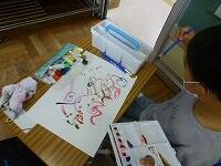 まっすぐな線,くるくる丸まった線,大きな点,小さな点,好きな色の絵の具を使って線や点を描いています。「動物を描こう」「〇〇な形を描こう」といったテーマを与えられた方が描きやすいらしく,初めは戸惑っていましたが,だんだん自分のイメージで様々な線が描けるようになりました。