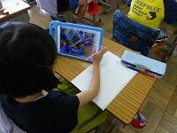 自分たちが育てている「やさい」の観察です。タブレットPC でいろいろな角度から写真を撮り,手書きの絵にして記録しています。手で描くことで,より細かな所まで意識することができるようになるそうですよ。