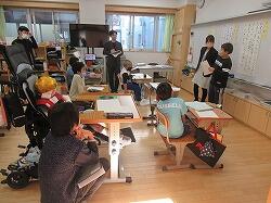 総合、国語、算数・・・といろいろな学習が、机の形もいろいろで展開しています。