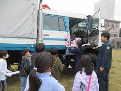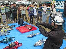 3つの体験コースに分かれて体験します。まずは、消防車や救急車の仕組みや実際に消火作業等で使う器具を見せてもらいます。