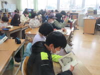 4時間目からの理科室では、昨日に引き続き、ボランティアのベルマーク整理活動が行われ、お父さんお母さんが26人もお集まりいただき、ベルマークの処理をしてくださいました。ありがとうございます。