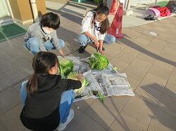 今朝は7時40分頃に、5年生がリヤカーに野菜を積んで校門から入ってきました。吉田さんの畑を借りて作っている野菜の一部を今日の授業参観への参加者に買っていただこう、ということです。農家の方と同じように、朝採れの野菜を並べることができるでしょうか?