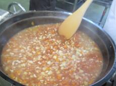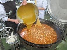 サラダの野菜から出てくる水分を、大きな釜を傾けて集めて、味が薄まらないように工夫をしています。