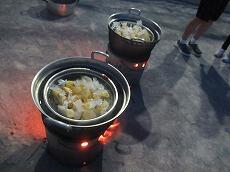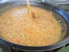 ガーリックピラフは、ご飯と具材を釜の中でしっかりと混ぜながら、仕上げていきます。