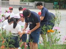 昨日も行ったドリームフラワープロジェクトの学校メイン花壇への移植を、美化委員会の子供たちとペレニアル花俱楽部の皆さんとで、業間休みに行いました。