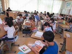 土っ子読書の時間でした。月1回業間休みから掃除の時間にかけての35分のうちの25分間が読書の時間になります。読み聞かせボランティアの方々が入る学年とお話ひろばのペープサート劇を見る学年があり、それ以外の学年はひとりひとりで読書をします。
