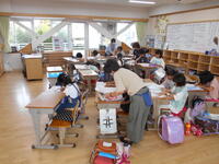 土小の縦割り活動は土っ子学級。業間休みに遊んだり、今年は一緒にそうじをしたり、1年生から6年生がグループになり、6年生がリーダーとして企画をしたものに取り組みます。