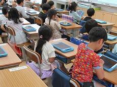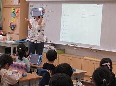 ICT支援の先生と担任の先生が1年生にipadの使い方を教えて、これからたくさん使っていきましょうね。ipadは勉強の道具ですね。