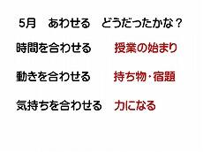 例えば、時間を合わせる=授業の始めに準備をして待てる。集合に遅れない。 動きを合わせる=忘れ物をしない どうでしょうか?各クラスで挙手してもらいながら、振り返りをしました。