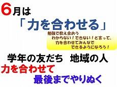 6月は気持ちを合わせて 力を合わせるにつないで欲しいというお話で、キーワードは「力を合わせる」です。学年で、また地域の人たちとも力を合わせて力を発揮しましょう。