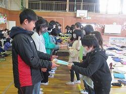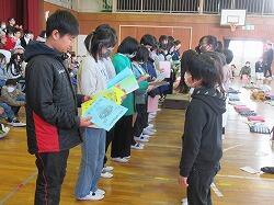 6年生に在校生からのメッセージが届けられ、6年生からは手作りの雑巾が各クラスに届けられました。