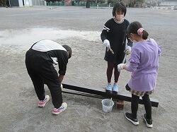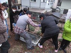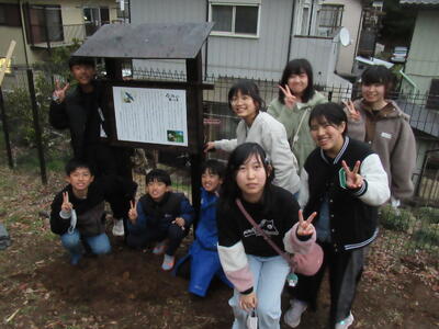 この後は、保護者の了解を得て、看板設置のためにきつね山に移動。セメントをこねて、日暮れが近づく中設置に向けて頑張りました・・・が、タイムリミットとなり、看板を穴に入れての記念撮影。