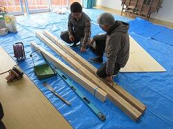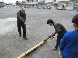 昔話課のメンバーは、板を切ったり、柱や板をバーナーで焼いたり、それをしっかりと磨いて、腐食剤を塗りこんで、看板の材料を作っていきます。