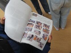 子供たちからは、プロジェクトの皆さんに手作りをしたポケットティッシュケースをプレゼント。プロジェクトの皆さんからは、看板づくりを記録した写真入りの手作り冊子をプレゼントしていただき、みんなで揃って記念写真。