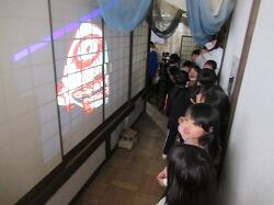 5年生は、国語の説明文で「まんがの方法」を読んだ。そこで漫画家がまんがで表現するために使っている手法が7つあると読み取った。その方法を活用した空間表現を図工でしてみよう。ということで、プロジェクションマッピングをプログラミングアプリを活用して作成して、校内を舞台にプロジェクターで映してみました。