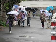 登校時間に、風と細かい雨が降る中、新しい学年への夢を抱えて登校してくる土っ子たち・・・
