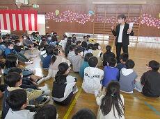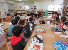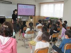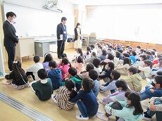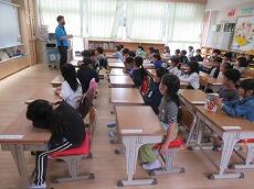 イングリッシュルームの先の昇降口を越えていくと、図書館です。図書館ではオリエンテーションが行われていました。本をたくさん使って学習したり、本をたくさん読んだり、大人いなってから大きな力になりますよ。一週間に2冊ずつ借りると、1年間で100冊ぐらい借りられます。低学年のうちにたくさん借りて、高学年になっても2冊は読んでいくと、6年間で1000冊になりますよ。