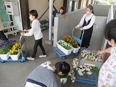 正門のエントランスに植えてあったパンジーは、入学式の装飾で購入したサフィニアに替わりました。用務員さんと栽培委員の皆さんで、がだんだん夏花壇に衣替えをしていきます。