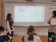 1年生の教室から昇降口に向かうと、昇降口すぐの教室は今年から「イングリッシュルーム」です。英語の授業はこの部屋で行います。それだけではなく、休み時間に先生がいらっしゃるときは、英語で色々なゲームやコミュニケーションができるのですよ!今日は、ALTのミカ先生もいらっしゃいました。