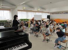 音楽室に行くと、今年から音楽の専門の先生に学ぶ2年生が最初の音楽の時間です。音楽室での授業も初めてになりますね。音楽ひらきを行っていました。