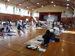 体育館に学年で集まって準備をし、練習をしています。