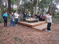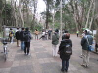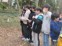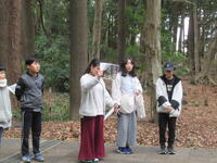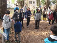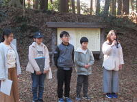 四郎兵衛坂を登ると、昔の道にはまだこんなにも自然が残っているのかという場所を抜けて、増尾城址公園に到着。土小の学区には二つも城址があるのです。城址公園では、城址公園の自然について調べたグループが、訪れる鳥や生き物、植物について写真を使いながら説明をしました。