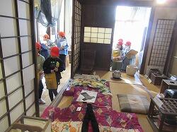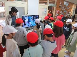 白い帽子は土小学校のガイド役です。1階では、色々な古い道具についての説明プレゼンを紹介しています。