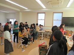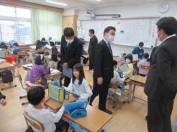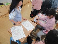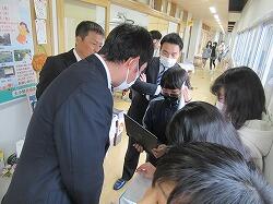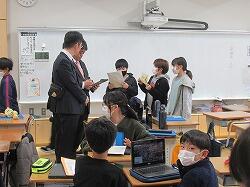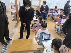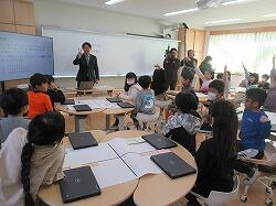 学校の説明をした後、3時間目の授業を見に校内をぐるりと歩いて視察してもらいました。2年生の教室では、算数ランドでかけ算の問題を出し合って楽しんでいる子供たちを・・・。1年生で経験した土っ子ランドを元に、2年生の算数の時間も最後はお互いに問題出し合って楽しもう!という目標をもって、かけ算をがんばって学んでいく、という仕掛けです。