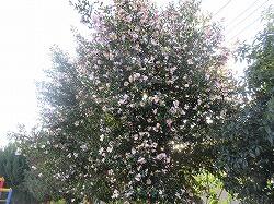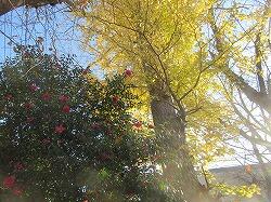 イチョウと一緒に赤いさざんかが見られるのは、県道に沿った交差点のところ。校庭には白いさざんかが満開になっています。